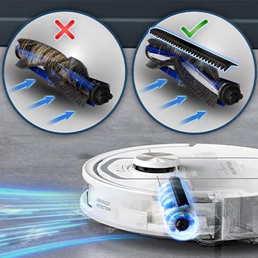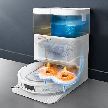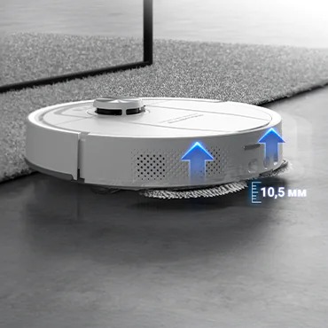 Робот оснащений подвійними обертовими мопами, що ефективно видаляють навіть найстійкіші плями, включно з забрудненнями у кутах та важкодоступних місцях. Для роботи на килимах передбачено автоматичне підняття мопа, щоб зберегти текстиль чистим і сухим. Потужність всмоктування до 10 000 Па гарантує глибоке очищення будь-яких поверхонь, а антизаплутувальна система Anti-Tangle запобігає намотуванню волосся на щітку, що забезпечує тривалу роботу без турбот.