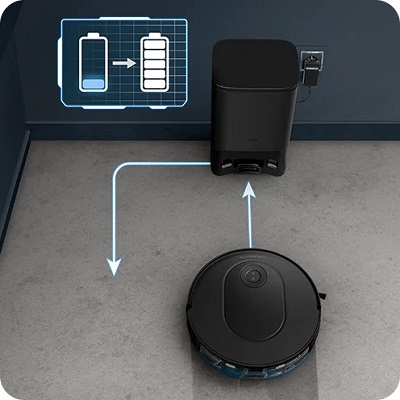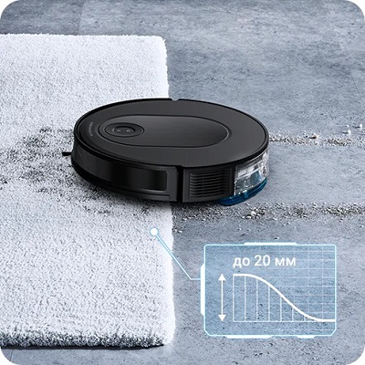 Висока ефективність очищення доповнюється потужністю всмоктування 2300 Па, яка забезпечує глибоке видалення стійкого бруду з твердих підлог і килимів. Робот легко долає пороги, килими та доріжки висотою до 20 мм, не втрачаючи стабільності руху. Для великих осель передбачена необмежена площа прибирання: якщо заряд зменшується, робот автоматично повертається на базу, заряджається та продовжує цикл з того місця, де зупинився.