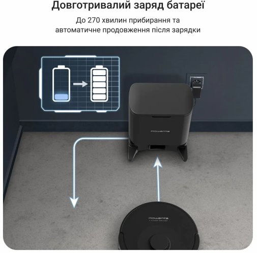Довготривала батарея робота дозволяє працювати до 270 хвилин, що покриває до 270 квадратних метрів на одному заряді. Якщо під час прибирання заряд розрядиться, робот самостійно повертається на базу для підзарядки, а потім продовжує прибирання з того місця, де зупинився.