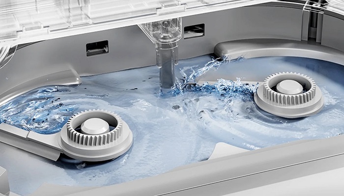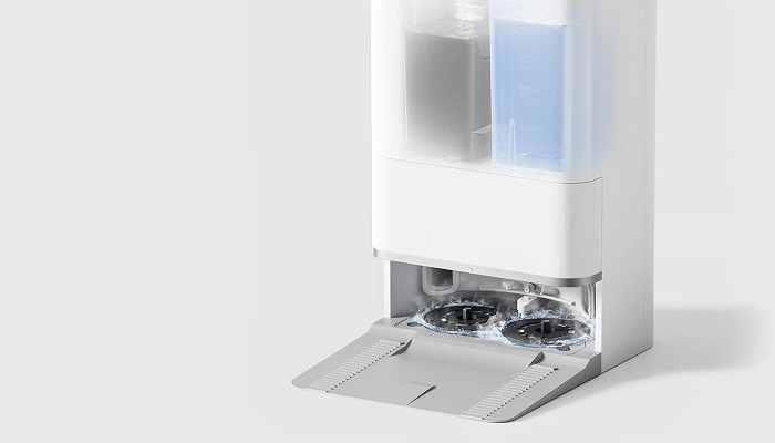 Не менш вражає й інтелектуальна база “Все-в-одному”. Вона не лише підзаряджає робот, а й самоочищується: подвійні обертові скребки миють швабри гарячою водою при 80 °C, після чого висушують їх гарячим повітрям, запобігаючи неприємним запахам. Великий резервуар об’ємом 4 л зменшує частоту доливання води, що особливо зручно для великих квартир чи будинків.