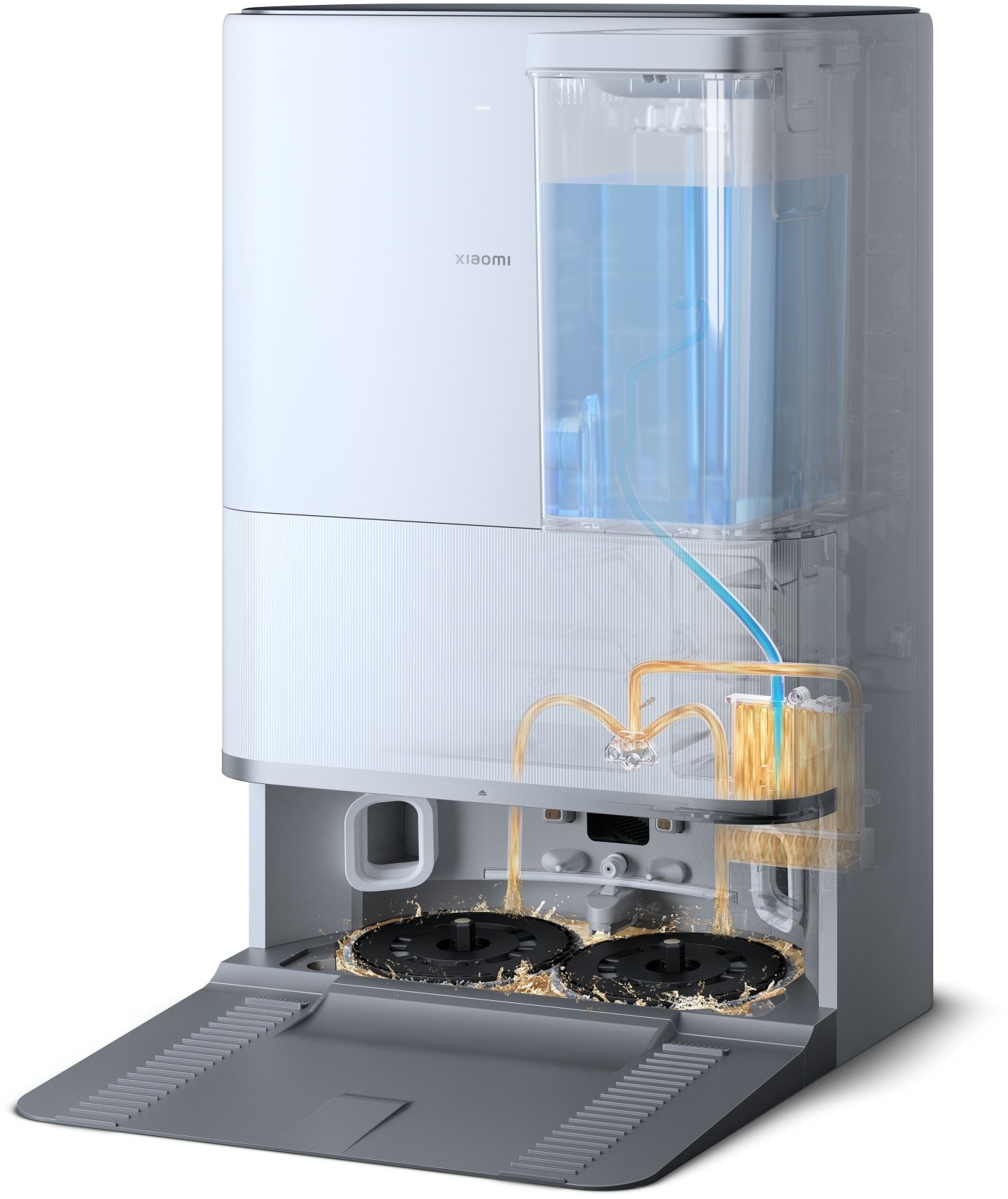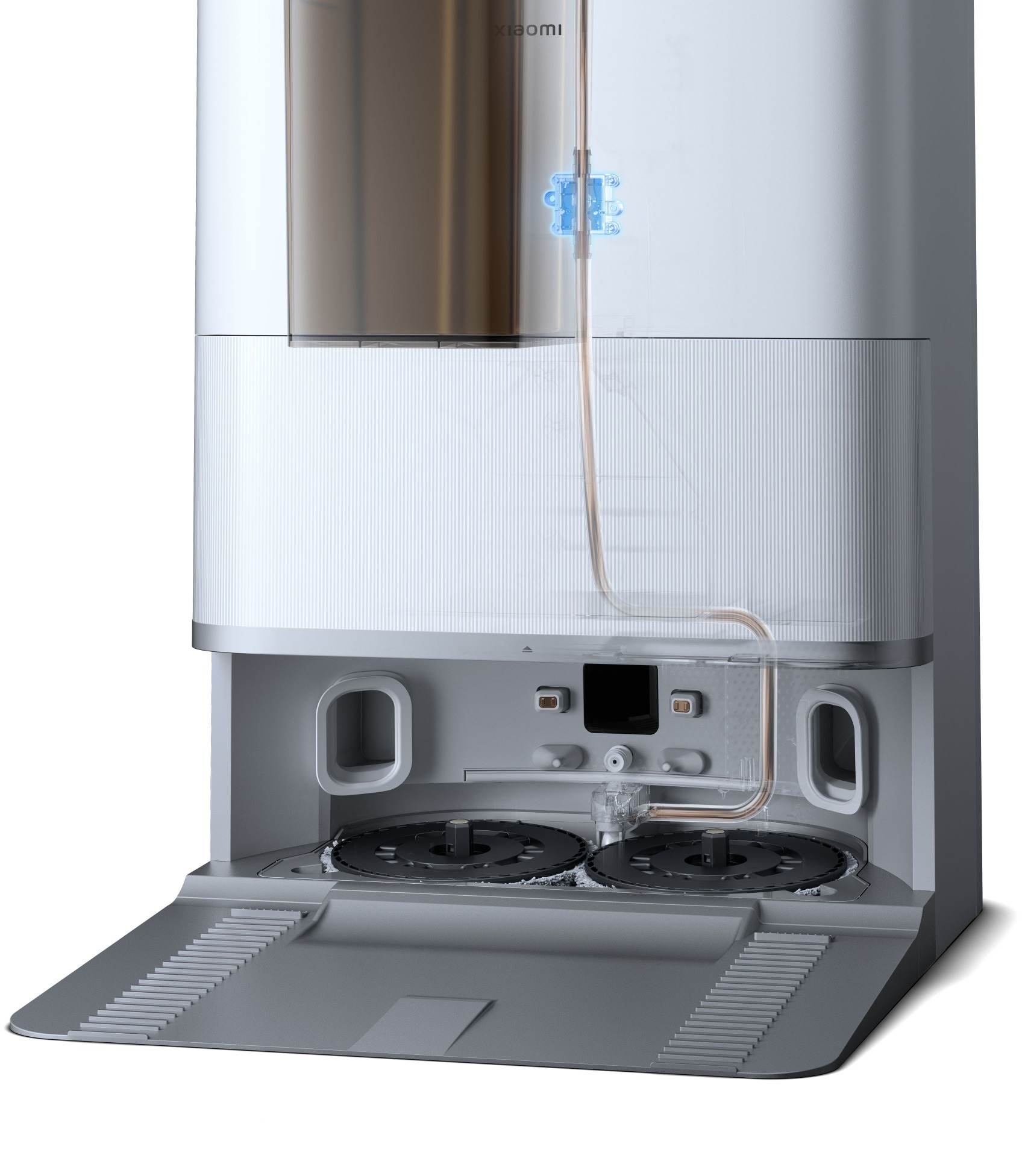 Багатофункціональна станція самоочищення робить догляд за пилососом максимально простим. Потужний двигун автоматично переносить зібране сміття в мішок об’ємом 2,5 л, якого вистачає приблизно на 75 днів прибирання без ручного очищення. Окрім цього, станція оснащена двома баками для води — на 4 л для чистої та 3,8 л для брудної. Цього об’єму достатньо, щоб очистити до 400 м² приміщення без додаткових втручань.