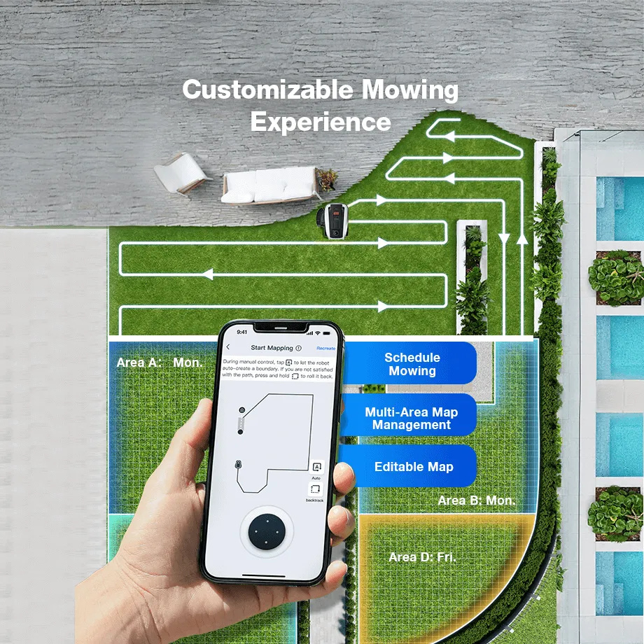 Зручний редактор мапи дає змогу додавати, об’єднувати, розділяти та видаляти зони відповідно до особистих уподобань. Крім того, користувачі можуть налаштовувати частоту косіння для окремих зон згідно зі своїм розкладом і потребами.