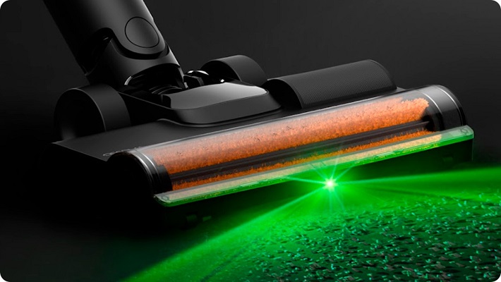 Інноваційна система підсвічування Green Light Dust Reveal допомагає бачити навіть найдрібніші частинки пилу. Зелений спектр світла робить бруд і волосся контрастними, дозволяючи ретельно очищати підлогу навіть у затемнених місцях — під меблями або в кутах.