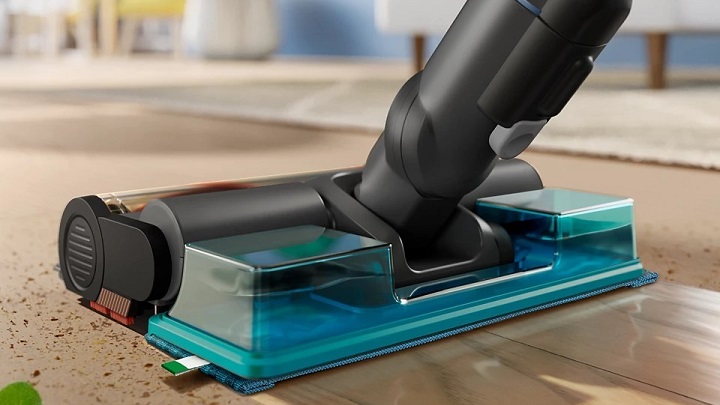 Для ефективного вологого прибирання передбачено знімний модуль Aqua, який використовує вологу мікрофіброву тканину для видалення плям і пилу одночасно із сухим очищенням. Це рішення дозволяє швидко освіжити підлогу без зайвих зусиль.