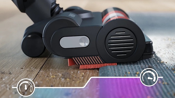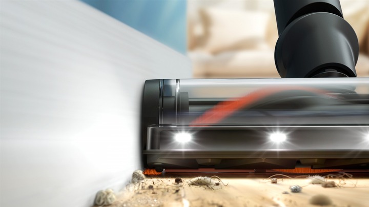 Для максимального результату прибирання використовується насадка TriActive Smart LED, яка адаптує потужність всмоктування під тип підлоги та видаляє до 99,9% пилу за один рух. Підсвічування LED допомагає помічати бруд у темних зонах — під меблями чи вздовж плінтусів. Додаткові бічні щітки з нульовим зазором дозволяють ретельно очищати кути та краї кімнат.