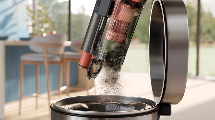 Очищення пилозбірника стало ще простішим — достатньо одного натискання кнопки, щоб видалити пил без контакту з брудом. Новий, збільшений пилозбірник дає змогу прибирати довше без необхідності спорожнення.