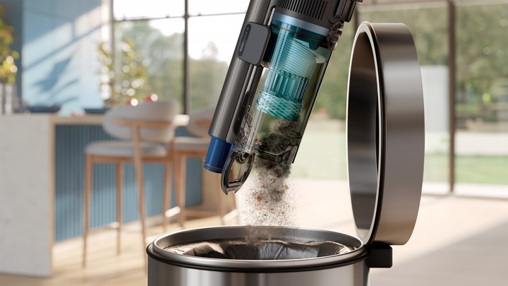 Очищення контейнера стало ще зручнішим — тепер достатньо одного натискання кнопки, щоб видалити пил і бруд, не знімаючи пилозбірник. Збільшений об’єм контейнера дозволяє довше прибирати без зупинок.