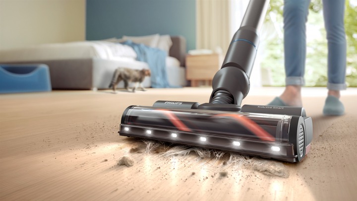 Розумна LED-насадка TriActive автоматично адаптує потужність всмоктування під тип покриття, видаляючи до 99,9% пилу та бруду за один прохід. Світлодіоди підсвічують пил навіть у темних кутах, щоб жодна ділянка не залишилась без уваги.