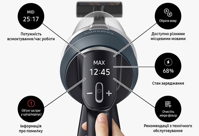 За допомогою РК-дисплею ви легко перевіряєте рівень всмоктування та час роботи акумулятора. Він також повідомить вас про проблеми та надасть можливі рішення для усунення несправностей.
