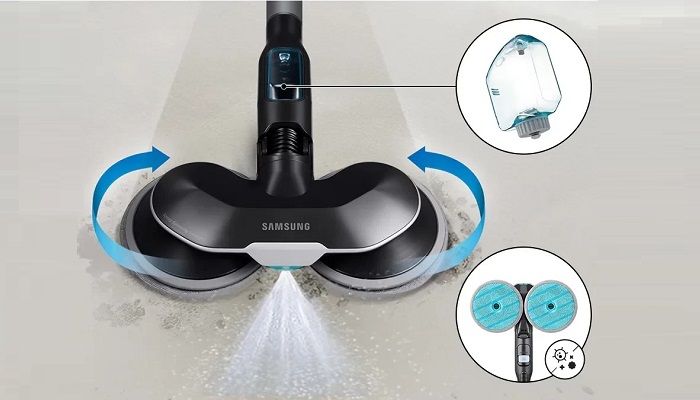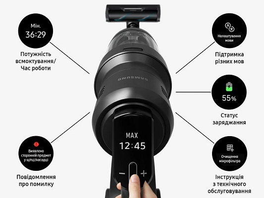 На LCD-дисплеї пилососа відображається режим роботи, рівень заряду акумулятора та діагностичні повідомлення. Wi-Fi вбудований, підтримується інтеграція зі SmartThings App (Android та iOS) для налаштування режимів, перегляду історії прибирання, самодіагностики та управління з будь-якого місця. При вхідному дзвінку на смартфон пилосос автоматично призупиняє роботу. Підтримується голосове управління Bixby кількома мовами та OTA-оновлення прошивки. Рівень шуму — 87 дБА. Вага пилососа без станції — 2,80 кг (зі Slim LED Brush+ та легким акумулятором), розміри — 250×1036×243 мм.
