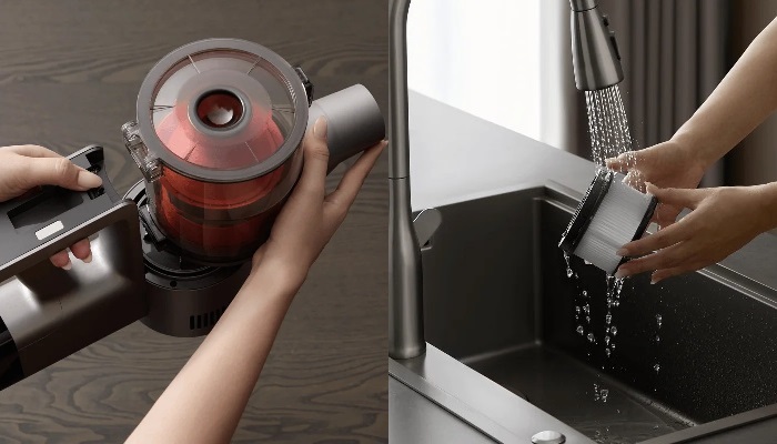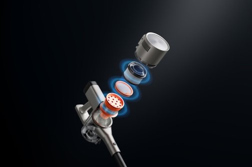 Особливу увагу приділено якості очищення повітря: система з 14-конусним циклоном ефективно відділяє пил від повітряного потоку, зменшуючи навантаження на фільтр і зберігаючи стабільну силу всмоктування. Додатково 5-ступенева система фільтрації з ефективністю 99,98% затримує навіть найдрібніші частинки розміром до 0,3 мкм, включаючи алергени та пилок, що робить пристрій ідеальним для домівок із підвищеними вимогами до чистоти.