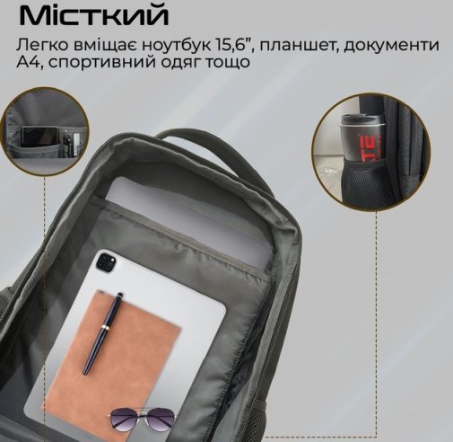 Рюкзак з великим внутрішнім об'ємом легко вміщує 15.6" ноутбук, планшет, документи формату А4, спортивний одяг та інші повсякденні речі.