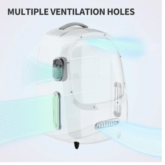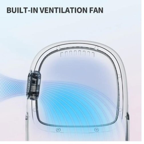 Переноска обладнана вдосконаленою вентиляційною системою з отворами з кожного боку, що забезпечують постійний доступ свіжого повітря. Вбудований вентилятор допомагає покращити циркуляцію повітря, коли це необхідно, а ручка на бічній панелі дозволяє регулювати потужність потоку повітря для досягнення оптимальної температури та комфорту для вашого кота.