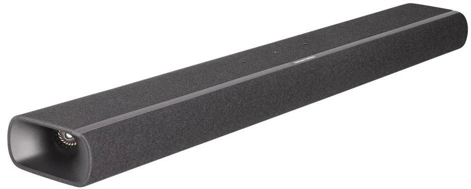 Дизайн виконаний у фірмовому мінімалістичному стилі Harman Kardon: тонкий елегантний корпус (870 × 65 × 130 мм, вага 3,5 кг) з преміальною тканиною та акуратним розташуванням сенсорних кнопок. Чорний колір виглядає стильно та нейтрально, ідеально вписується в будь-який інтер’єр — від сучасного мінімалізму до класичної вітальні.