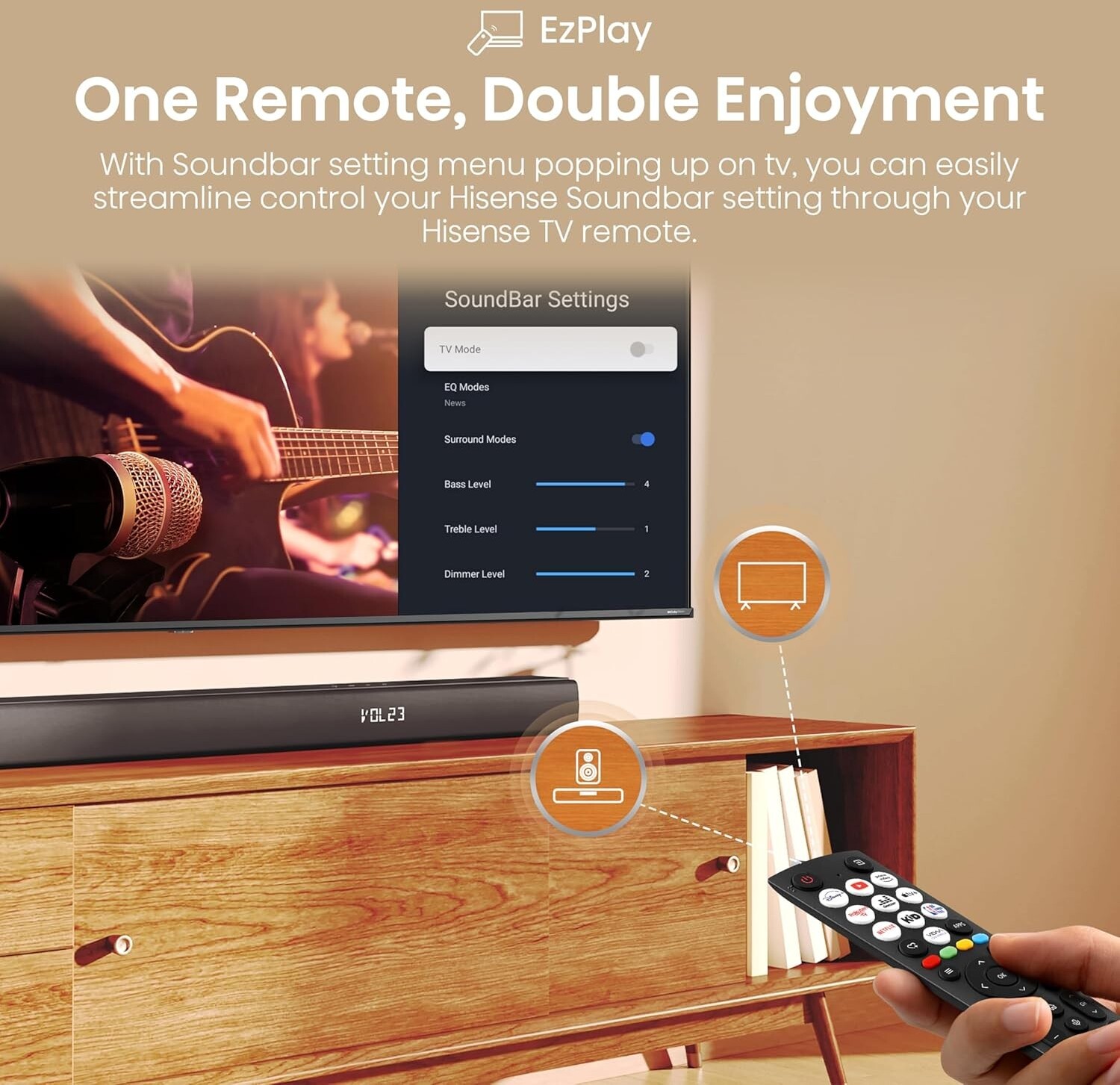 Компактний і низькопрофільний дизайн дозволяє розмістити саундбар під телевізором або повісити на стіну, зберігаючи охайний вигляд кімнати. Пульт дистанційного керування дає змогу швидко регулювати гучність і змінювати режими звуку з будь-якого місця.