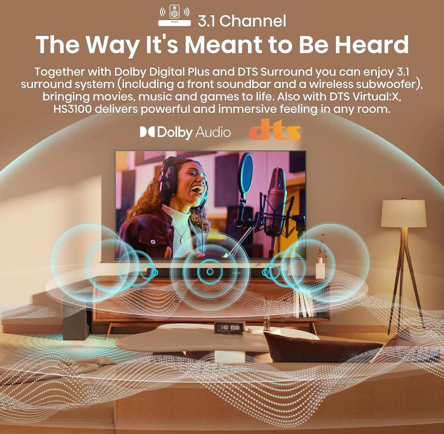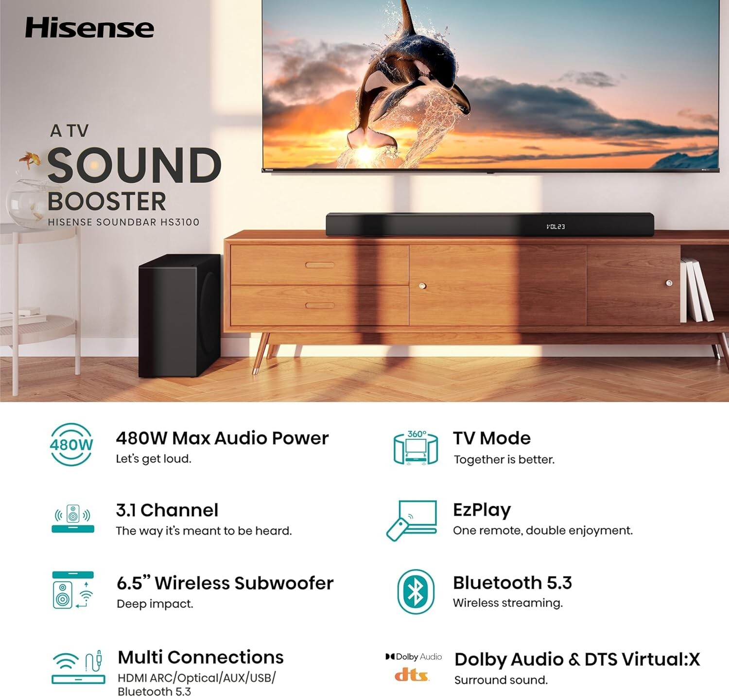 У результаті Hisense HS3100 поєднує потужний звук, глибокі баси бездротового сабвуфера, підтримку Dolby Audio та DTS, просте підключення через кілька входів і Bluetooth — ідеальний вибір для перегляду фільмів, ігор та прослуховування музики.