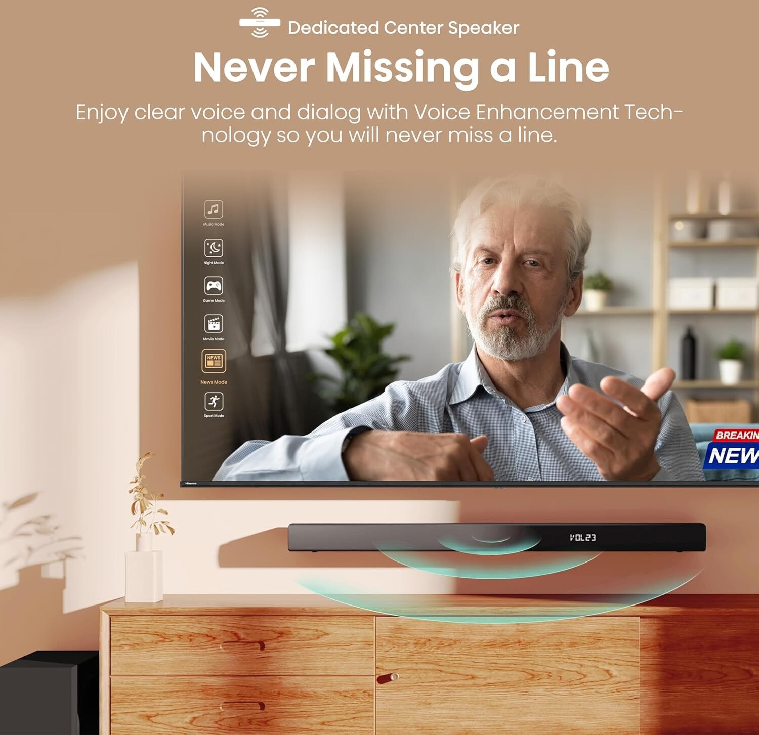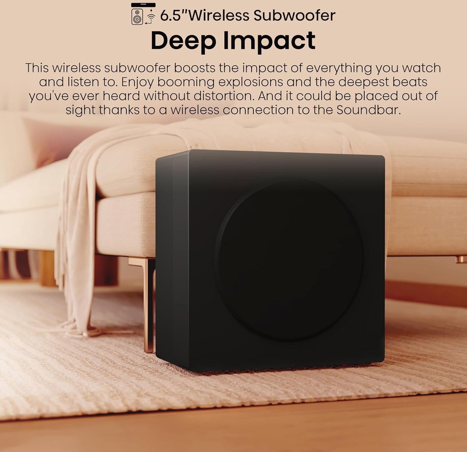 Він оснащений 6,5-дюймовим бездротовим сабвуфером, який підсилює глибокі баси та забезпечує об’ємний звук без зайвих кабелів, дозволяючи розмістити сабвуфер будь-де. Підтримка Dolby Audio та DTS робить ефекти та музику більш захопливими, створюючи об’ємне звучання, що повністю занурює у події на екрані.