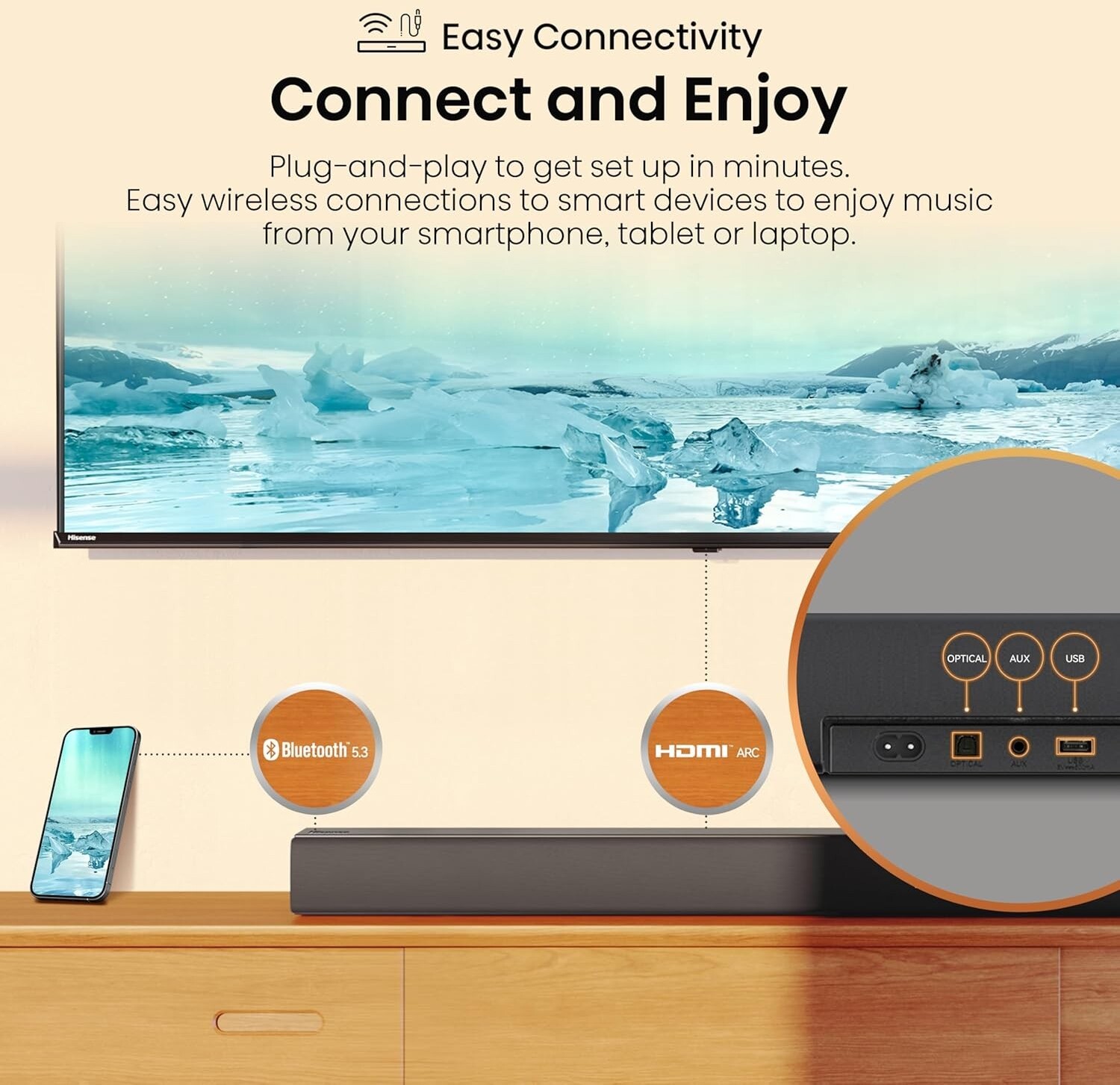 Для зручності саундбар підтримує потокове передавання через Bluetooth, що дозволяє бездротово транслювати музику зі смартфонів або планшетів, а наявність входів HDMI ARC, оптичного, USB та AUX забезпечує легке підключення телевізорів, консолей та плеєрів. Спеціальний режим телевізора Hisense покращує звучання фільмів, роблячи діалоги та ефекти ще чіткішими.