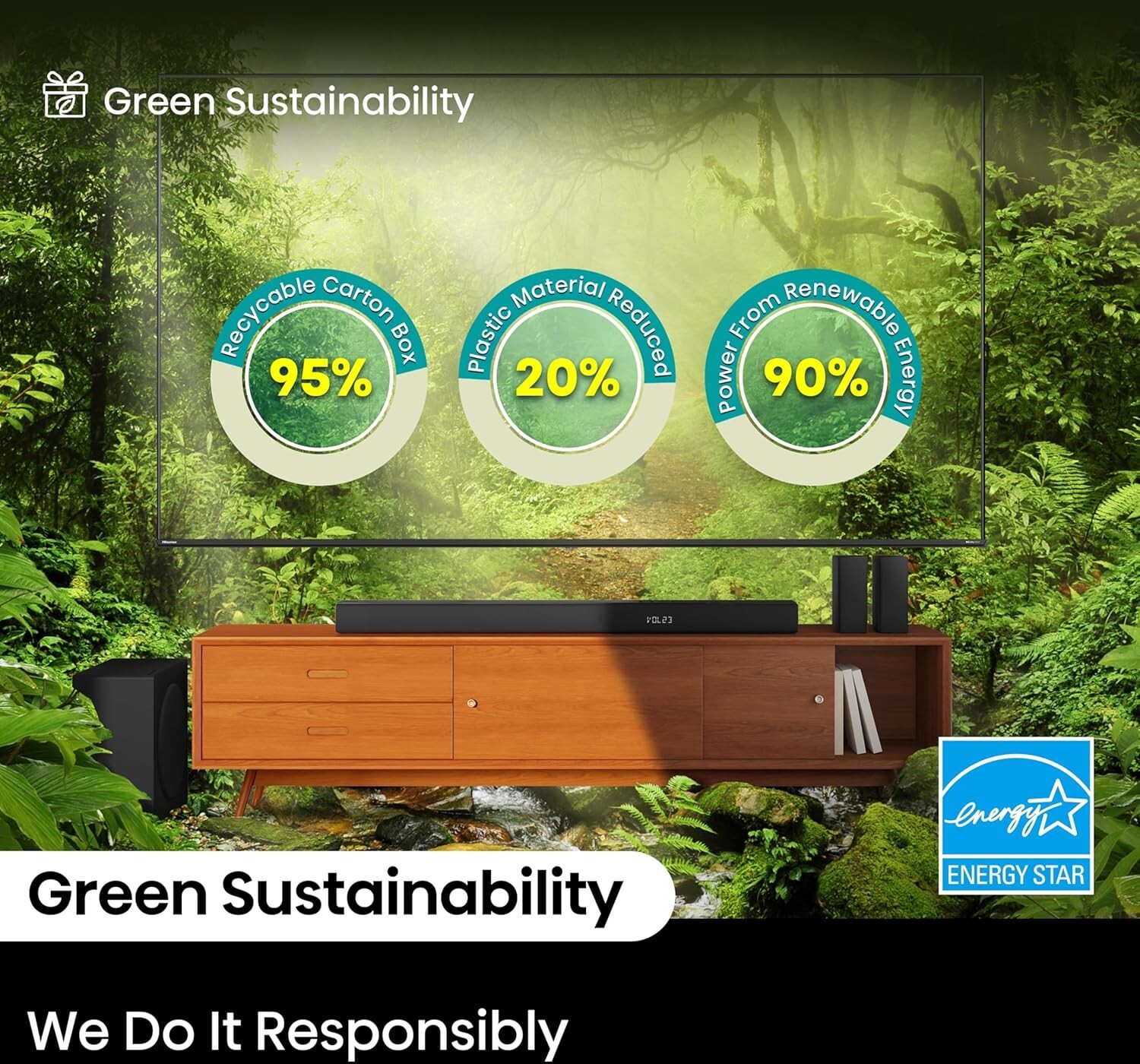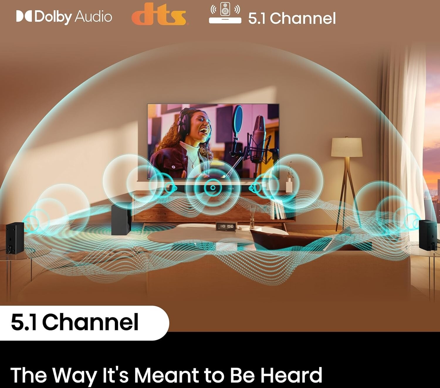 Саундбар Hisense HS5100 — це потужна аудіосистема з 5.1-канальним звуком і вихідною потужністю 540 Вт, яка перетворює вашу кімнату на справжній домашній кінотеатр. Завдяки фронтальним, центральним та об’ємним динамікам і бездротовому сабвуферу звук стає насиченим, деталізованим та об’ємним, а діалоги відтворюються чітко, що робить кожну сцену реалістичною та захопливою.