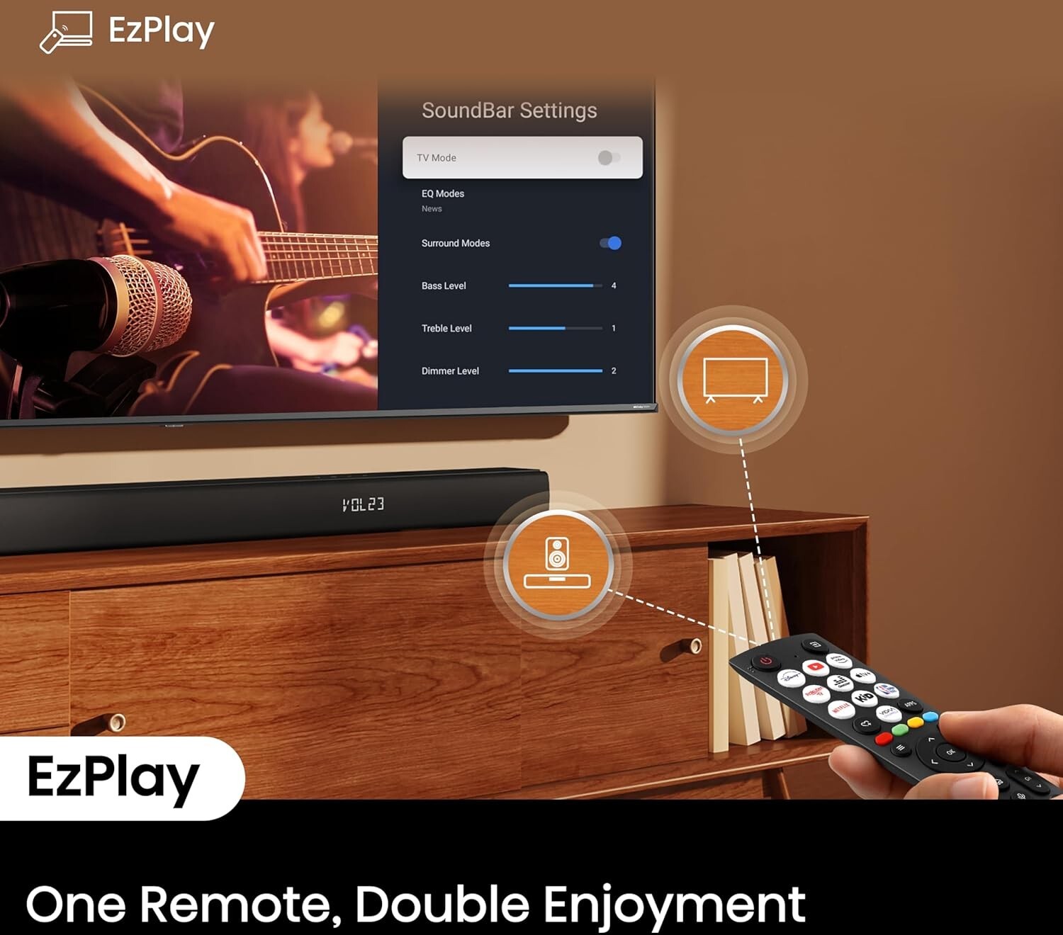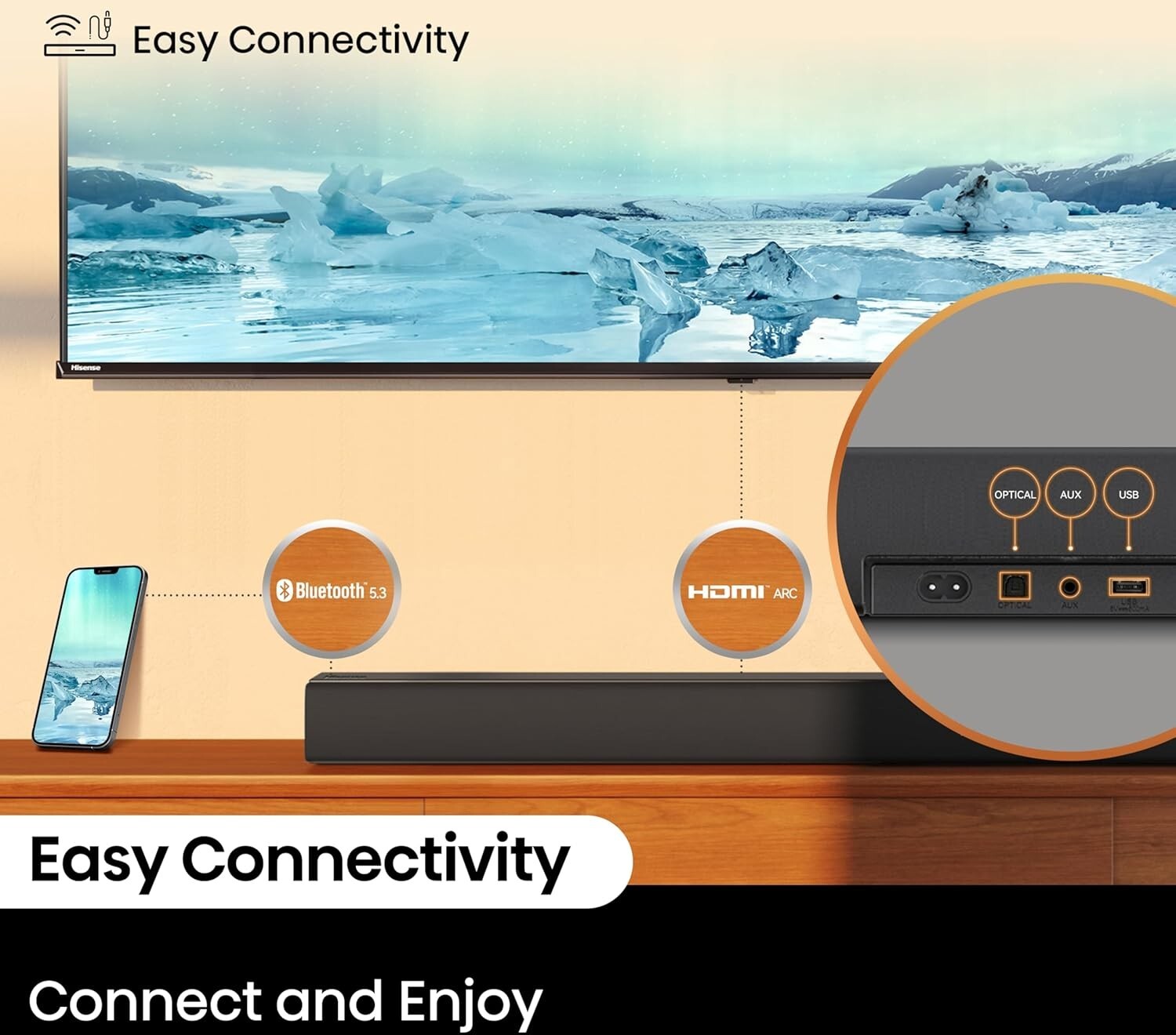 Саундбар Hisense HS5100 постачається з пультом дистанційного керування, що спрощує регулювання гучності, режимів і налаштувань. Його легке підключення та керування дозволяють насолоджуватися високоякісним звуком для фільмів, музики та ігор без зайвих зусиль.