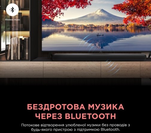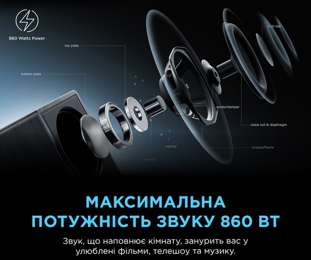 Глянцевий дизайн з елементами, натхненними зібер-мистецтвом, додає нотку футуризму — панель сяє, як чорне дзеркало, а сабвуфер з дерев'яним корпусом для резонансу басів стоїть непомітно, але відчувається в кожному ударі серця.