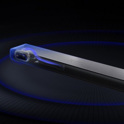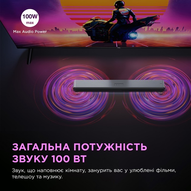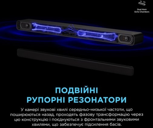 Уявіть: елегантна чорна панель довжиною 81 см з глянцевим фінішем, що елегантно вписується в інтер'єр, але вибухає енергією, коли активується Dolby Atmos і DTS Virtual:X, перетворюючи плоский стереозвук на тривимірну хвилю, де дощ у "Той, хто біжить по лезу" шепоче згори, а рев двигуна в "Форсажі" вібрує в грудях, з потужністю 100 Вт, що заповнює простір до 25 м² глибокими тонами та чистими високими, ніби саундбар оживає й танцює з екраном, створюючи ефект присутності без потреби в громіздкій акустиці.