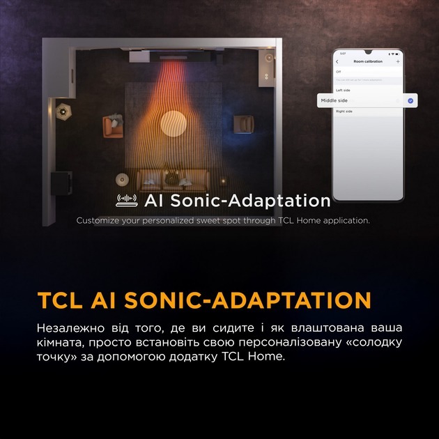 Автоматичне калібрування кімнати (AI Sonic) через Bluetooth-додаток TCL Home аналізує акустику за допомогою мікрофона смартфона, адаптуючи баси та висоти під ваші стіни та меблі за лічені секунди, ніби розумний диригент, що налаштовує оркестр під ваш простір, з підтримкою HDMI eARC, що дозволяє передавати високоякісні, несжаті аудіоформати, такі як Dolby Atmos і DTS Virtual\:X, від телевізора до саундбара. Це гарантує найкращу можливу якість звуку без втрат під час передачі, створюючи більш захопливий аудіодосвід для ваших фільмів, музики та ігор.
