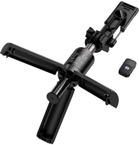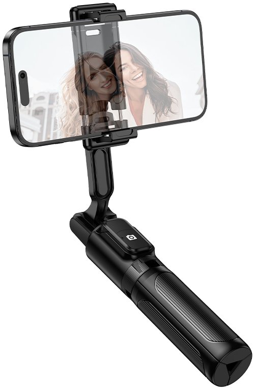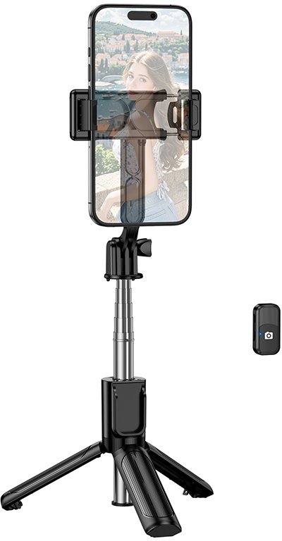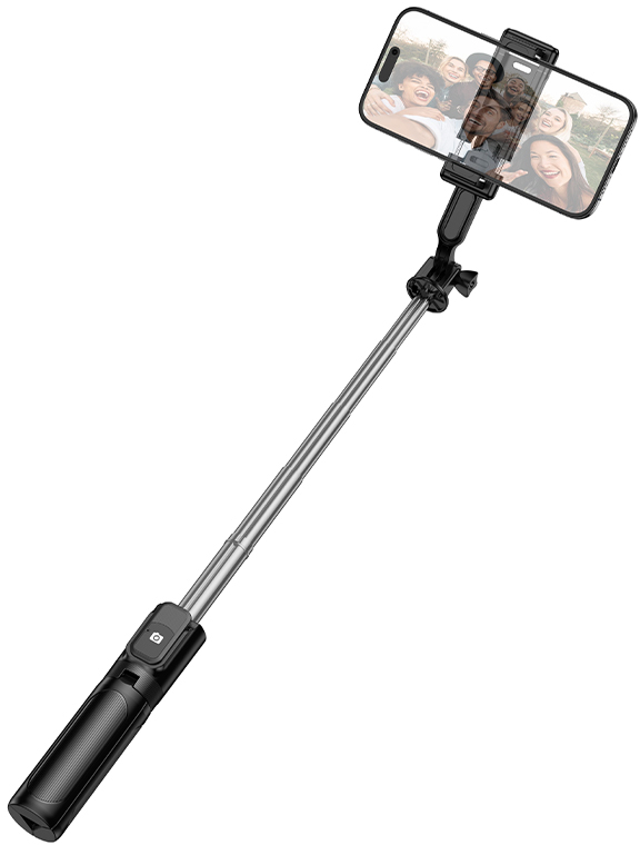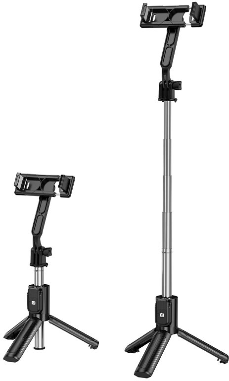 Вбудована тринога гарантує стабільність на будь-якій рівній поверхні, а знімний Bluetooth-пульт дозволяє робити знімки на відстані без трясіння камери. Універсальний тримач з поворотом на 360° та регулюванням нахилу надійно фіксує смартфони.