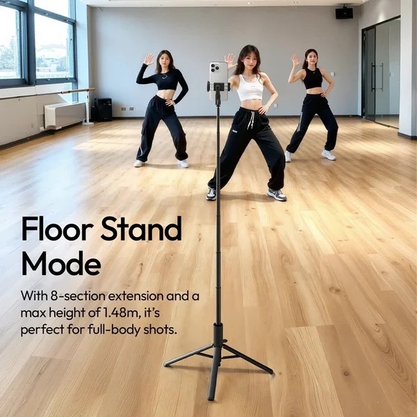 До комплекту входить Bluetooth-пульт дистанційного керування з радіусом дії до 10 м, який зберігається в рукоятці штатива. Він підтримує iOS, Android та HarmonyOS і дозволяє робити фото і відео без дотику до смартфона — ідеально для сольних зйомок на вулиці, групових селфі або стримінгу.