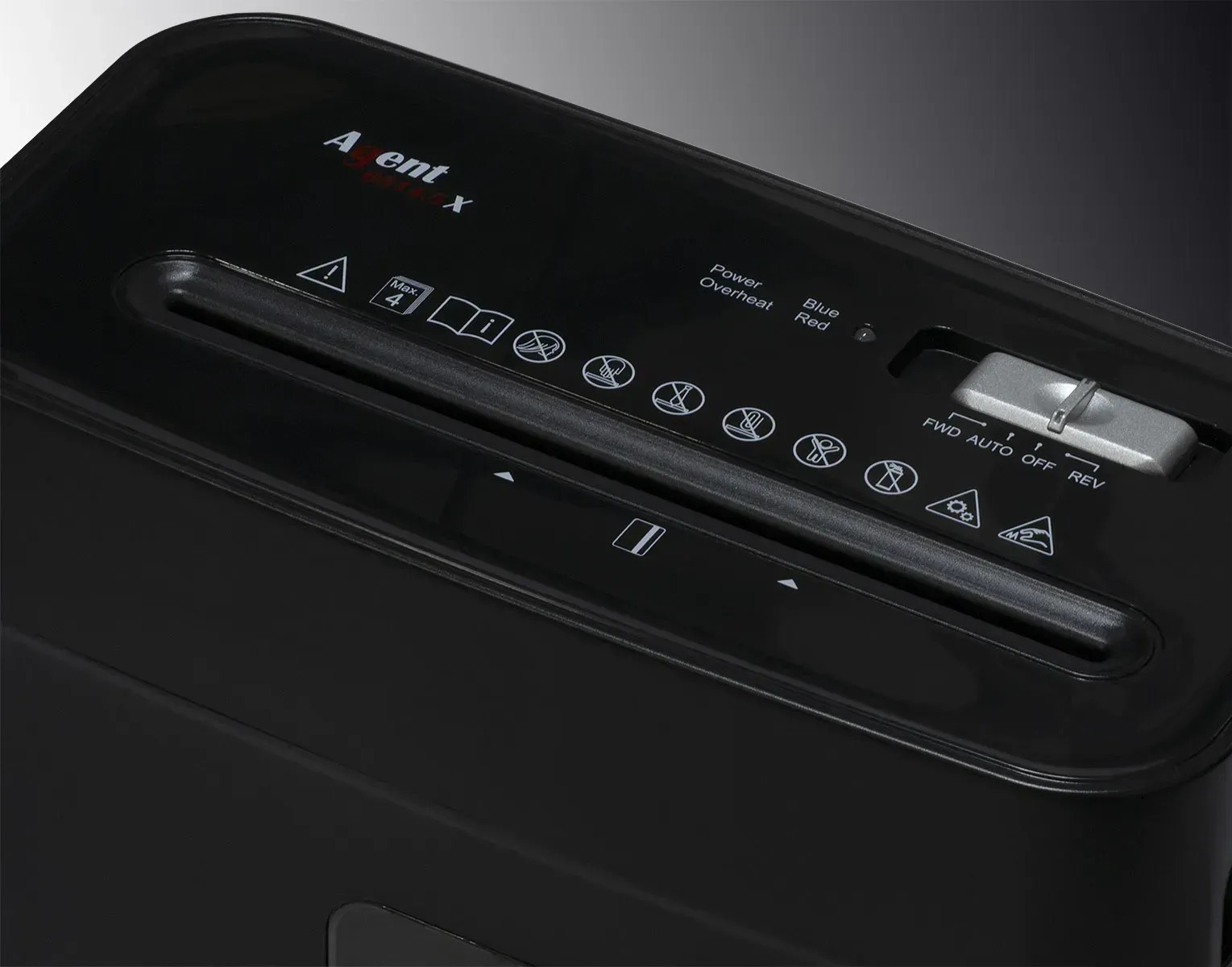 Пристрій приймає документи, скріплені скобами та скріпками, без необхідності їх попереднього видалення. Окрім паперу, Agent 0514.5 X знищує пластикові картки в окремому відсіку — що робить його повноцінним рішенням для знищення всіх носіїв конфіденційної інформації. Автоматичний старт та стоп вмикають шредер одразу при подачі документів і зупиняють після завершення, а автоматичний реверс запобігає заминанню паперу без участі користувача. На панелі керування відображаються індикатори заминання паперу, переповнення кошика, відчинених дверцят та перегріву двигуна. Термозахист двигуна від перегріву та перевантажень гарантує безпечну тривалу експлуатацію.
