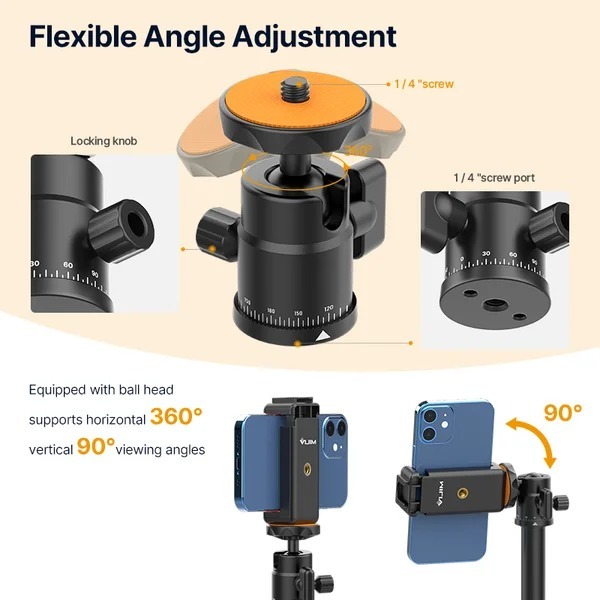 Кульова головка з різьбовим з'єднанням 1/4" зверху і знизу обертається на 360° по горизонталі та має виріз на 90° для зйомки у вертикальній орієнтації. Інтегрована шкала точності 360° спрощує створення панорамного контенту, а фіксуючий гвинт утримує головку в потрібному положенні.