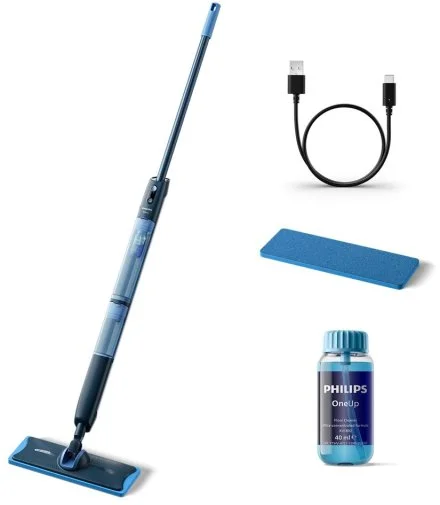 Електрошвабра оснащена дисплеєм для контролю заряду та USB-зарядкою, що робить підзарядку легкою та зручною — навіть через портативний акумулятор. Використання ультраконцентрованого картриджа засобу Philips OneUp дозволяє замінити до трьох пляшок звичайного миючого засобу та провести до 40 сеансів ефективного прибирання, безпечного для всієї родини та домашніх тварин.