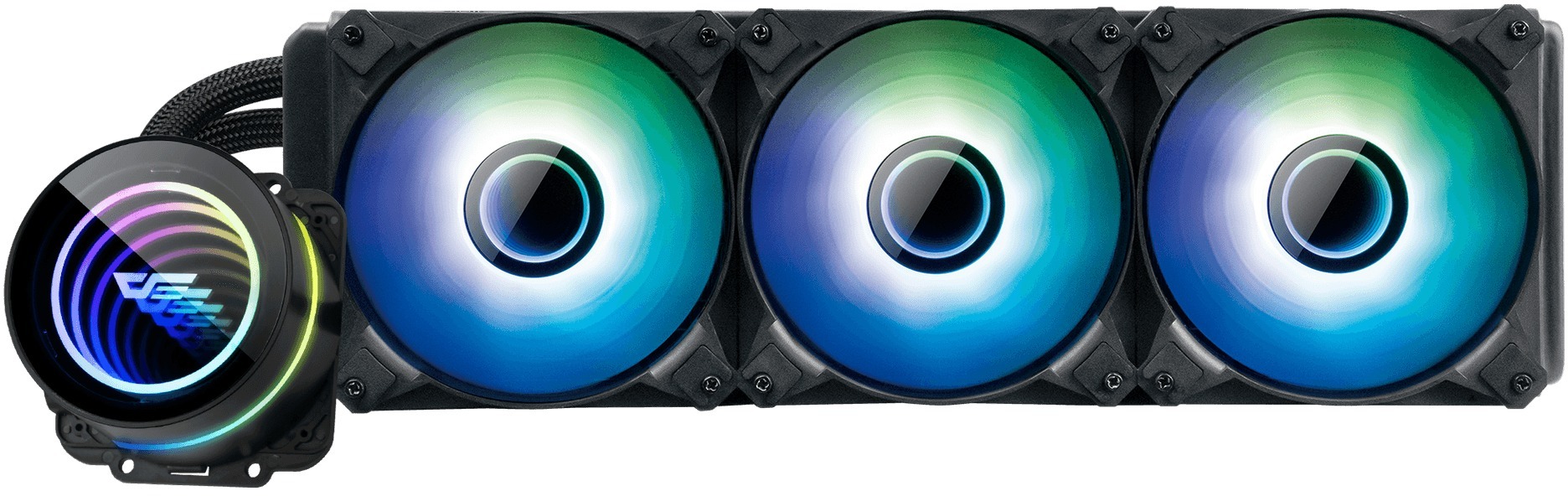У чорному кольорі з матовим покриттям і яскравим ARGB-підсвічуванням на помпі та вентиляторах він виглядає як елемент кастомної збірки преміумкласу — Infinity Mirror ефект створює нескінченний тунель світла, що пульсує в ритмі гри чи музики. 360-мм радіатор з трьома 120-мм вентиляторами забезпечує потужний потік повітря та високу тепловіддачу, легко справляючись з топовими процесорами Intel та AMD (включно з Ryzen 9 та Core i9), навіть при розгоні.