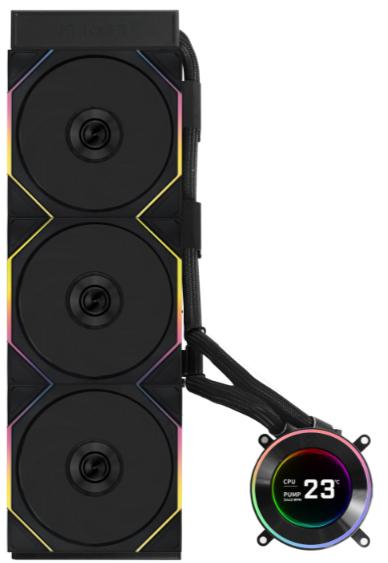 Особливістю системи є 2.1-дюймовий IPS-екран (480×480, 500 ніт, 60 Гц) на водоблоці, який відображає температуру охолоджувача, швидкість помпи або кастомізований контент (зображення, GIF, відео) через L-Connect 3 у режимі USB-підключення. Три режими керування дозволяють налаштовувати екран і підсвічування: Offline (без USB, через обертання кільця на насосі), Wireless (через L-Wireless контролер) і Streaming (повна кастомізація через USB). Бокові серверні гофровані трубки із трьома регульованими кріпленнями створюють “безтрубний” вигляд, інтегруючи кабелі живлення та USB у трубки для чистого кабель-менеджменту. Система підтримує сокети Intel LGA 1700/1851 і AMD AM5/AM4, забезпечуючи універсальність.