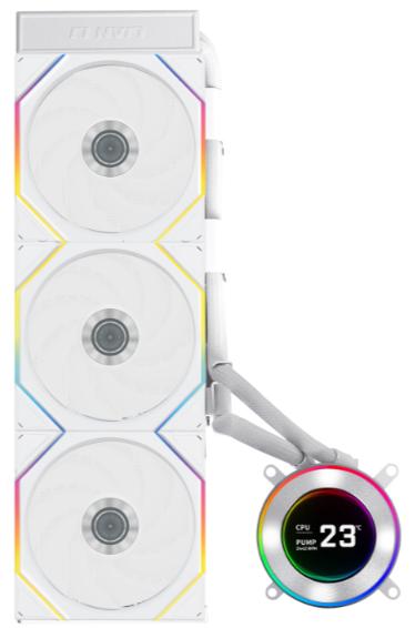 Особливістю системи є 2.1-дюймовий IPS-екран (480×480, 500 ніт, 60 Гц) на водоблоці, який відображає температуру охолоджувача, швидкість помпи або кастомізований контент (зображення, GIF, відео) через L-Connect 3 у режимі USB-підключення. Три режими керування дозволяють налаштовувати екран і підсвічування: Offline (без USB, через обертання кільця на насосі), Wireless (через L-Wireless контролер) і Streaming (повна кастомізація через USB). Бокові серверні гофровані трубки із трьома регульованими кріпленнями створюють “безтрубний” вигляд, інтегруючи кабелі живлення та USB у трубки для чистого кабель-менеджменту. Система підтримує сокети Intel LGA 1700/1851 і AMD AM5/AM4, забезпечуючи універсальність.