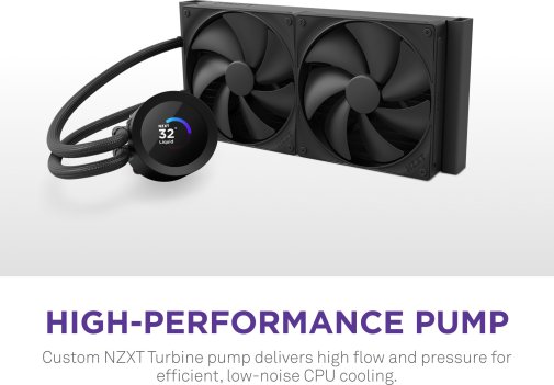 Яскравий 1,54-дюймовий квадратний LCD-екран дозволяє відображати температуру системи, анімовані GIF-зображення, власні зображення або вебінтеграції, такі як Spotify чи YouTube, із повним налаштуванням через програмне забезпечення NZXT CAM. Вентилятори з високим статичним тиском забезпечують ефективне розсіювання тепла через радіатор, а режим Zero RPM зупиняє їх за низьких навантажень для безшумної роботи.