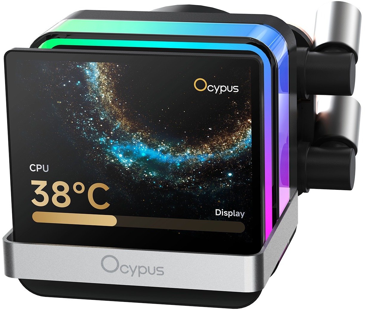 Головною особливістю є 3,5-дюймовий квадратний IPS-екран на водоблоці з роздільною здатністю 640×480 і ультратонкими рамками. Екран відображає реальний час системну інформацію, підтримує зображення, відео, GIF та кастомні теми через спеціальне ПЗ Ocypus Display. Плаваючий дизайн водоблока з магнітним кріпленням дозволяє легко повертати його в портретний або ландшафтний режим, а яскрава рамка додає глибини та преміального вигляду.