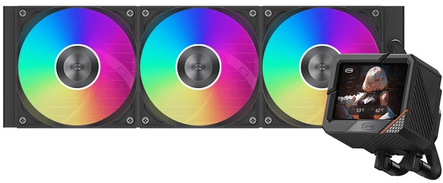 PCCooler GT360M ARGB Display — це система рідинного охолодження (AIO) формату 360 мм для тих, хто шукає потужне та тихе охолодження процесора з ефектним підсвічуванням і вбудованим дисплеєм на помпі. Модель орієнтована на збірки середнього та вищого класу, де важливі і температурні показники, і естетика відкритого засклення корпусу.
