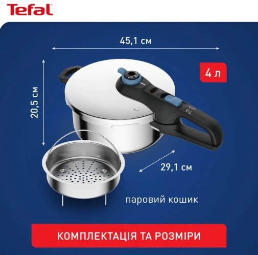 Скороварка Tefal Secure Trendy створена для тих, хто цінує швидкість, безпеку та зручність на кухні. Завдяки технології приготування під тиском вона дозволяє готувати у два рази швидше, ніж у звичайній каструлі Tefal, тож навіть складні страви можна подавати значно оперативніше, не жертвуючи смаком та якістю.