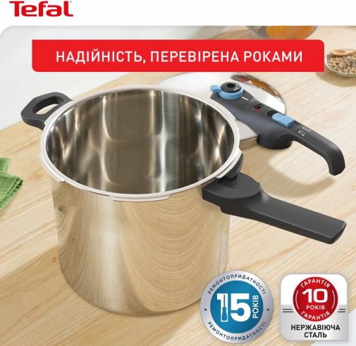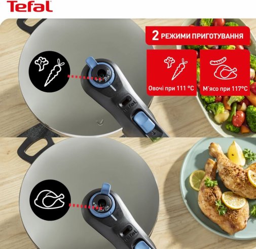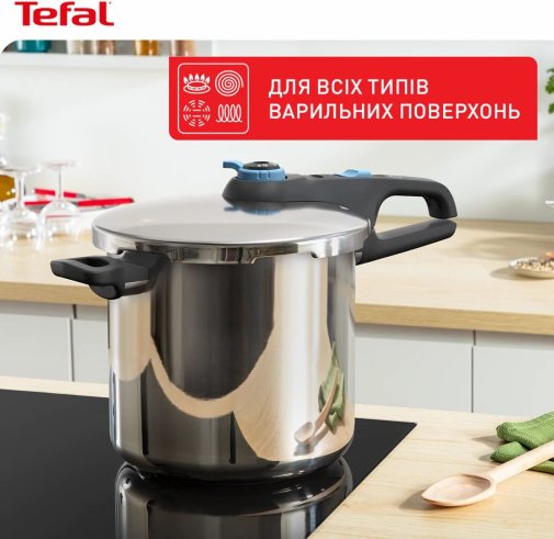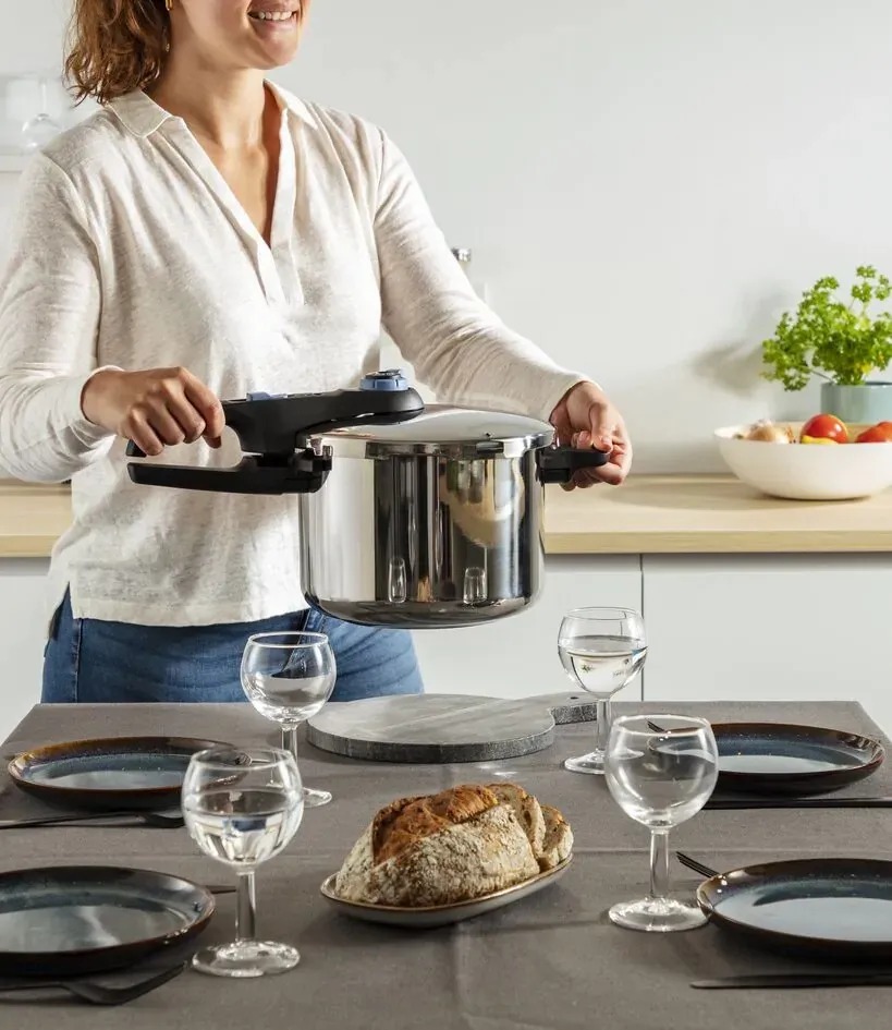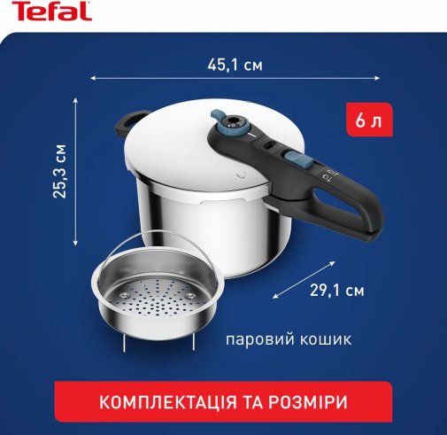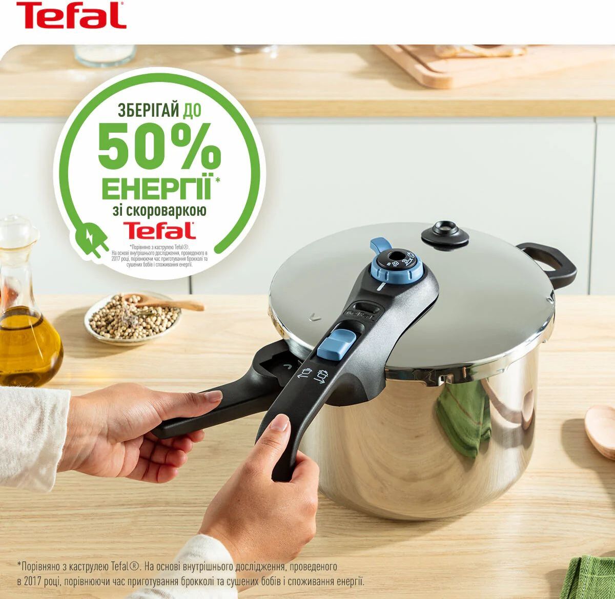 Скороварка Tefal Secure Trendy створена для тих, хто цінує швидкість, безпеку та зручність на кухні. Завдяки технології приготування під тиском вона дозволяє готувати у два рази швидше, ніж у звичайній каструлі Tefal, тож навіть складні страви можна подавати значно оперативніше, не жертвуючи смаком та якістю.