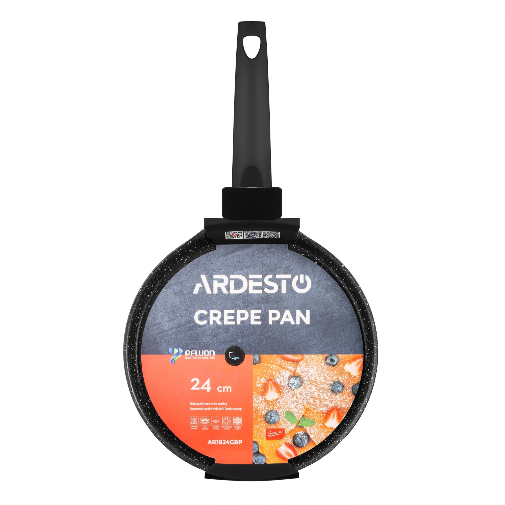 Сковорода для млинців Gemini Daiano – це стильний і функціональний посуд чорного кольору для тих, хто цінує якість і комфорт на кухні. Виготовлено виріб із кованого алюмінію, забезпечуючи рівномірне нагрівання. Завдяки двошаровому мармуровому протипригарному покриттю PFLUON перевертання млинців легке та без прилипання. Руків’я з бакеліту з Soft-touch-покриттям залишається прохолодним навіть під час інтенсивного готування. Діаметр становить 24 см, товщина стінок 2,5 мм і дна 2,6 мм. Сковорода сумісна з газовими, електричними, склокерамічними, галогенними та індукційними плитами. Мити її потрібно вручну, адже вона не призначена для очищення в посудомийній машині.
