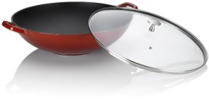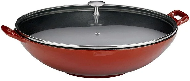 Сковорідки вок з високими стінками та маленькою площею дна спеціально сконструйовані таким чином, щоб їжу в них можна було готувати на великому вогні, часто з мінімальною кількістю жиру, або без нього, в тому випадку, коли продукти готуються при постійному інтенсивному перемішуванні. Ця технологія приготування їжі називається "stir-fry", що буквально так і перекладається - смаж перемішуючи. Продукти, приготовані за технологією stir-fry, зберігають свою соковитість, колір і більшу частину вітамінів та корисних мікроелементів.Провідний німецький виробник посуду і кухонного начиння - компанія KELA представляє сковороду вок з кришкою KELA Calido. Сковорода виготовлена з чавуну, вкритого жаростійкою емаллю. Чавун прекрасно проводить та розподіляє тепло по поверхні, що дає можливість правильно приготувати овочі, м'ясо, рибу і морепродукти за східними рецептами. У сковороді вок KELA Calido об'ємом 4 літри, за рахунок її особливої форми та розміру, вміщається велика кількість інгредієнтів, що важливо під час приготування страв азіатської кухні.Чавунний вок KELA Calido можна використовувати в якості сковороди, каструлі, казана, сотейника. Він придатний для смаження, тушкування, бланшування, пасерування продуктів, як на відкритому вогні, так і в духовій шафі.