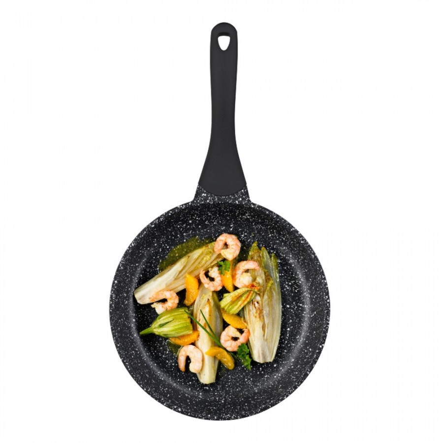 Здавалося б, що може бути простіше сковорідки - звичайне металеве корито з ручкою (або без неї). Можливо так і є, але тільки не у випадку зі сковорідкою KELA Stella Nova від провідного виробника посуду і кухонного начиння - компанії KELA. У сковорідці Stella Nova зібрані передові розробки, що поліпшують якість приготування їжі і роблять життя кухарів і домогосподарок простіше. Основа з литого алюмінію значно зменшує вагу сковорідки. Такий алюмінієвий сплав не схильний до корозії і вкритий особливою оксидною плівкою - вона не дасть їжі в процесі приготування контактувати безпосередньо з металом при випадковому пошкодженні антипригарного покриття. Саме антипригарне покриття виготовлене за технологією Oil Control System. Воно шорсткувате за своєю структурою, тому не дозволяє розігрітій олії збиратися в одній частині сковороди, й олія рівномірно розподіляється по всьому денцю. Денце сковорідки KELA Stella Nova в нижній частині укріплено диском з нержавіючої сталі. Завдяки цій конструктивній особливості денце не деформується під впливом високих температур, а тепло від конфорки рівномірно розподіляється по поверхні, дозволяючи продуктам прожарюватися однаково добре і ближче до центру, і під бортиками.