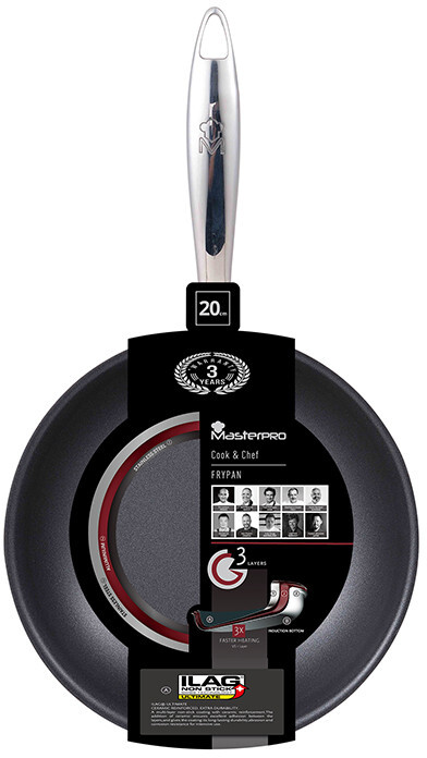 Сковорода 20 x 4,5 з колекції Masterpro, виготовлена з нержавіючої сталі та алюмінію, забезпечує економію енергії, необхідну у повсякденному житті, не змінюючи при цьому смак і властивості їжі. Це одна з найкращих альтернатив для шеф-кухарів, оскільки вона надзвичайно довговічна. Вона має багатошарове антипригарне покриття ILAG Ultimate з керамічною основою, яке також запобігає подряпинам і прилипанню їжі до поверхні, що полегшує її очищення. Завдяки індукційному дну ця приголомшлива сковорода підходить для всіх типів плит (газових, електричних, індукційних, галогенних, склокерамічних). Ергономічна ручка з покриттям Soft-Touch і Stay-cool, що запобігає опікам, забезпечить вам комфортне користування під час приготування їжі та стійкість до зносу з часом. Сковорода дозволяє смажити з невеликою кількістю олії, що робить ваші рецепти набагато здоровішими. Потужне антипригарне покриття дозволяє підсмажити яйце без використання краплі олії. Дизайн класичної чорної сковорідки зі сріблястими металевими деталями та гладкою, приємною на дотик поверхнею. Сріблясте дно сковорідки має технологію Ultra Turbo Induction, вона нагрівається повністю і рівномірно на 20% швидше, зберігаючи при цьому набагато більше тепла, зменшуючи витрати на електроенергію і час приготування. Її габарити, форма, розмір і легкість, разом з яскравим полірованим покриттям, роблять цю сковороду незамінним предметом на вашій кухні. Для продовження терміну служби рекомендується ручне миття.