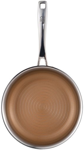 Внутрішнє покриття — тришарова non‑stick система з міцним тефлоновим шаром, яка дозволяє готувати з мінімальною кількістю масла й легко мити посуд без потертостей. Зовнішнє покриття стійке до появи подряпин і змін кольору, тому сковорода зберігає презентабельний вигляд навіть після інтенсивного використання.