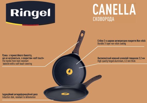 Сковорідки з колекції Canella виготовлені з високоякісного кованого алюмінію з товщиною стінки 3,2 мм і має тришарове надстійке антипригарне покриття. Це дозволяє готувати будь-які страви з максимальним комфортом, економією і користю для здоров'я, адже Ви можете значно скоротити витрати олії і жиру під час смаження.