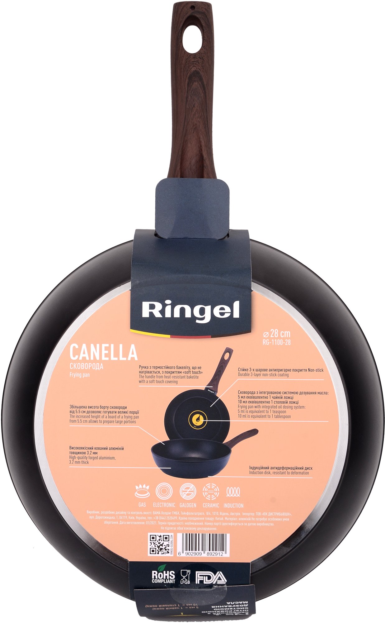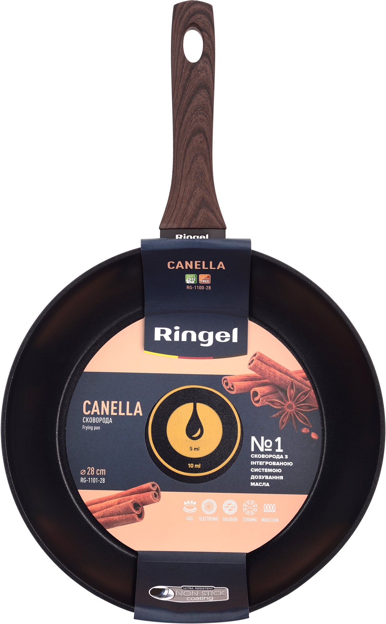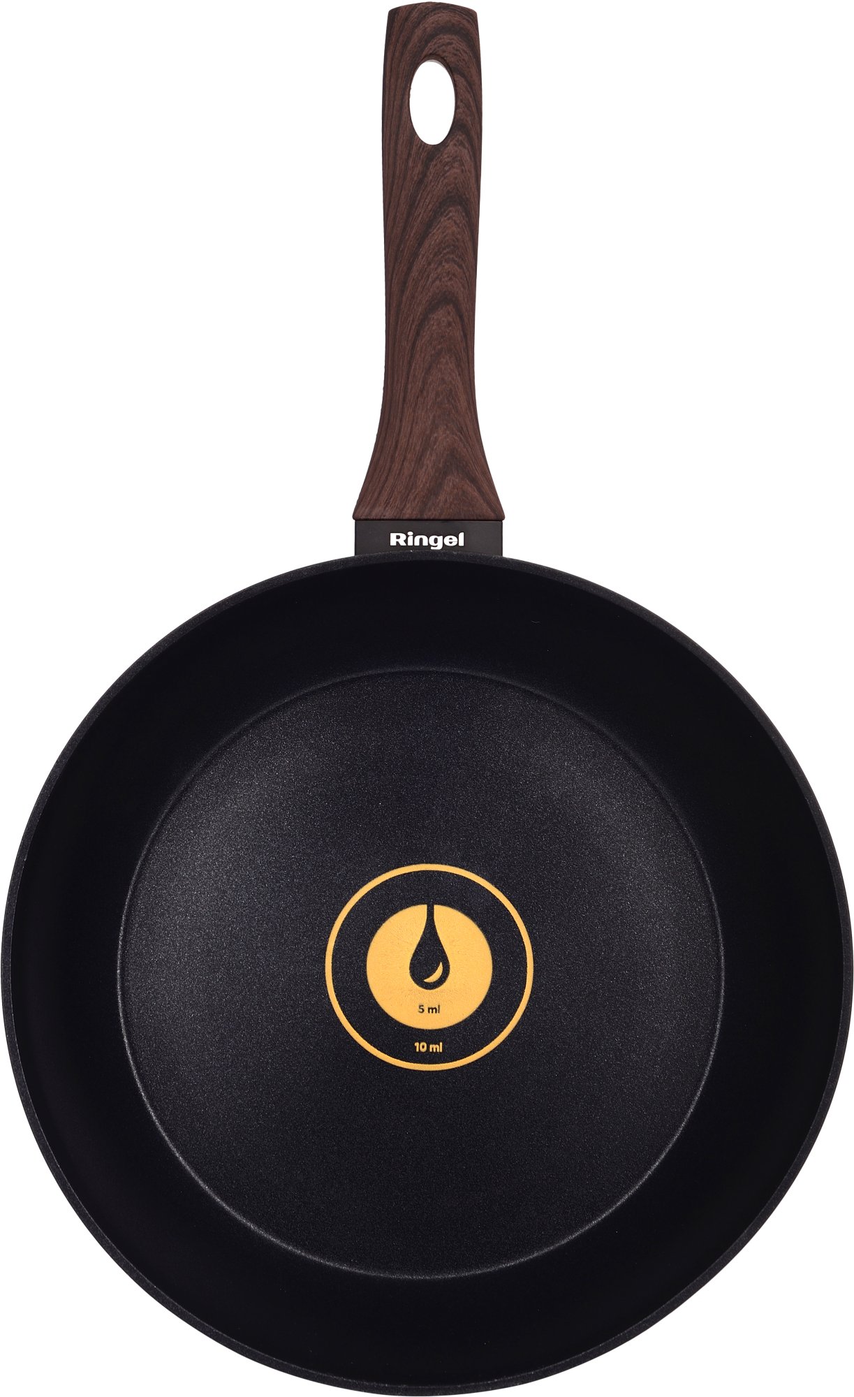 В кожну сковороду RINGEL інтегрована перша в світі система дозування олії. Найменша поділка системи відповідає 5 мл олії, а більша – 10 мл олії. За допомогою цієї системи ви зможете легко та швидко приготувати водночас здорові та смачні страви з використання мінімуму жиру та з максимальним збереженням корисних речовин у страві.