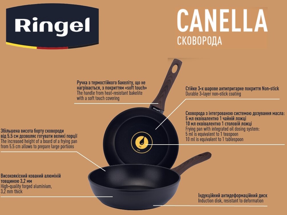 В кожну сковороду RINGEL інтегрована перша в світі система дозування олії. Найменша поділка системи відповідає 5 мл олії, а більша – 10 мл олії. За допомогою цієї системи ви зможете легко та швидко приготувати водночас здорові та смачні страви з використання мінімуму жиру та з максимальним збереженням корисних речовин у страві.