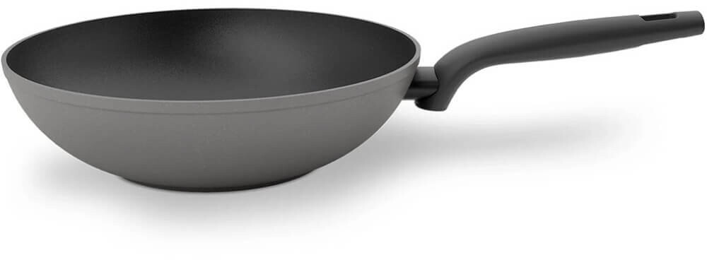 Сковорода має діаметр 28 см, виконана у круглій формі та сірому кольорі. Вона виготовлена з переробленого алюмінію з антипригарним покриттям, стійким до подряпин, і підходить для використання на будь-яких типах плит, у тому числі індукційних.