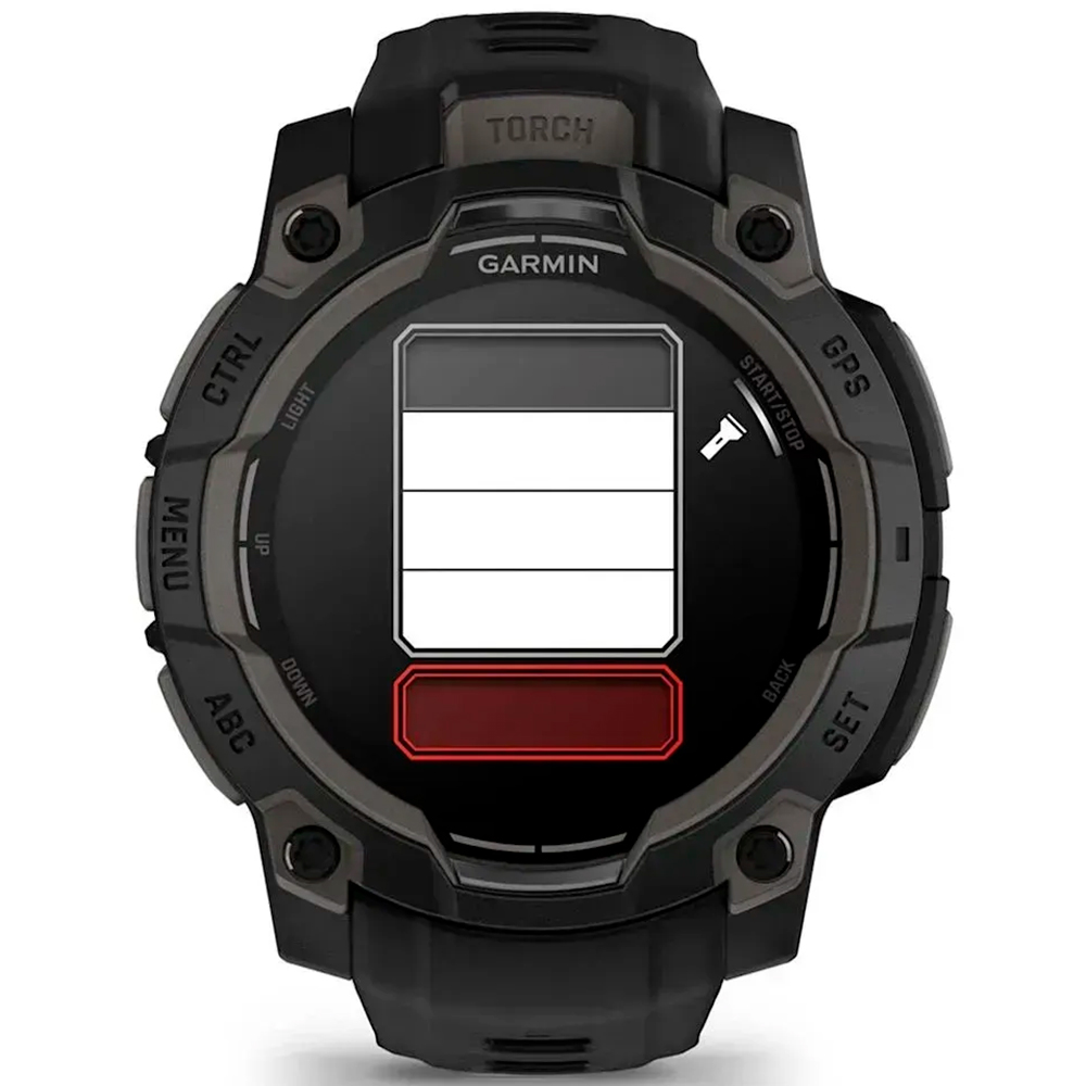 Garmin Instinct 3 вирізняється винятковою тривалістю роботи батареї. У режимі смартгодинника AMOLED-модель працює до 18 днів, у режимі GPS — до 32 годин.